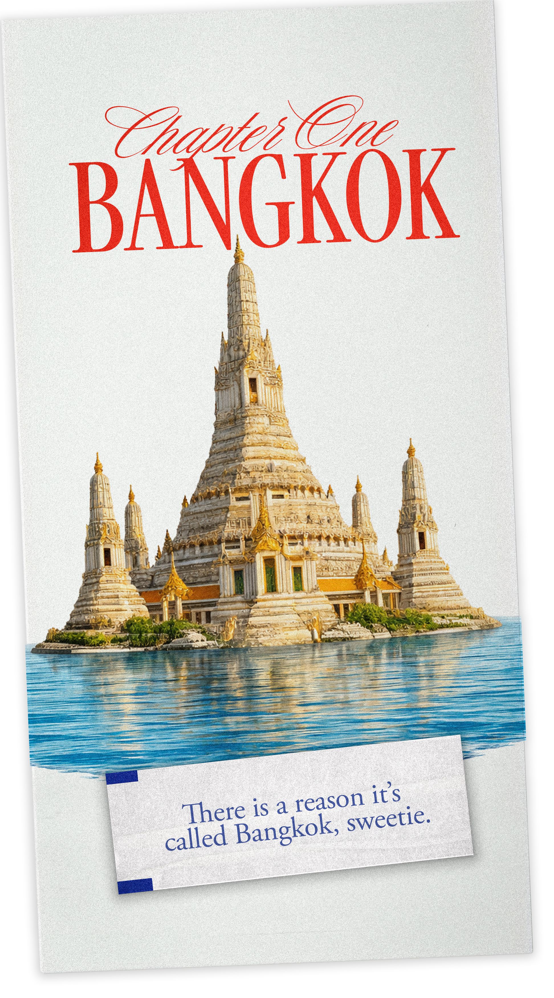 Neon lights. Rooftops. Temples. Tuk-tuks. Street food at 2am Cocktails with a view. Side quests after dark: “how exactly did we get here?”